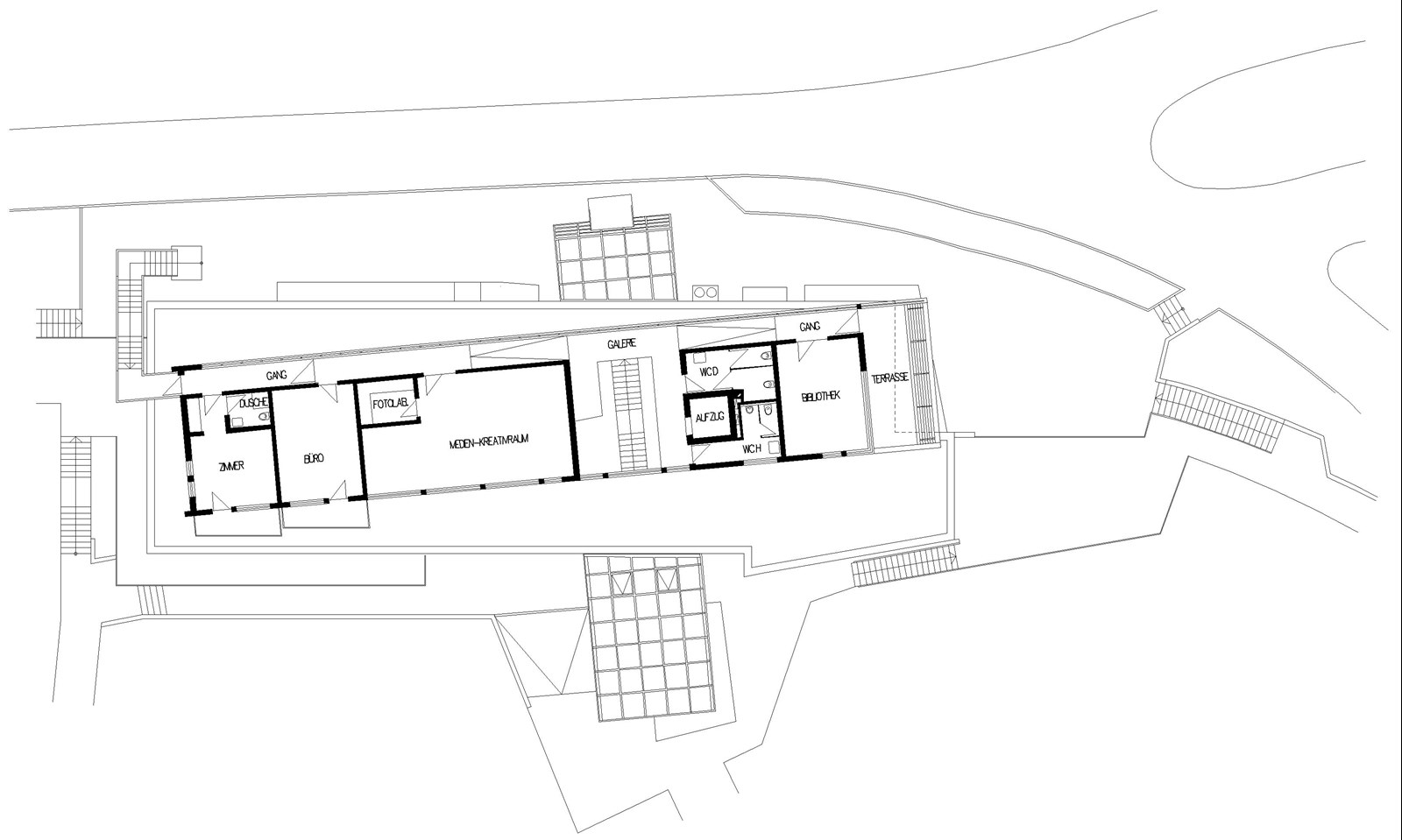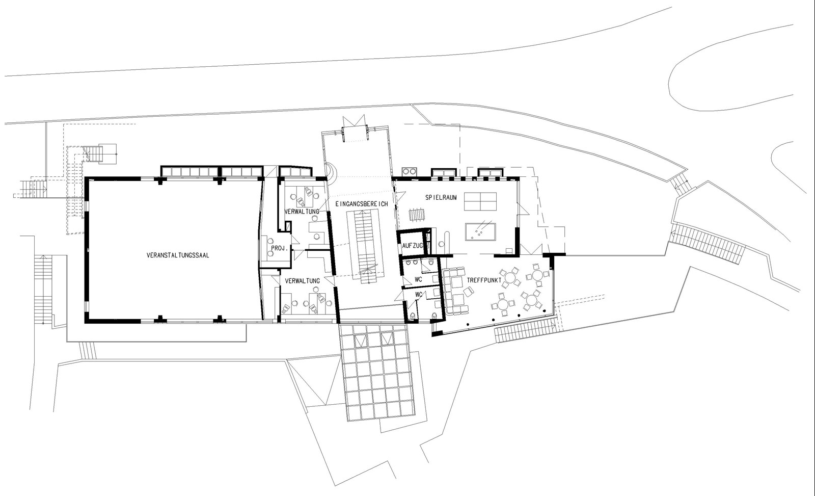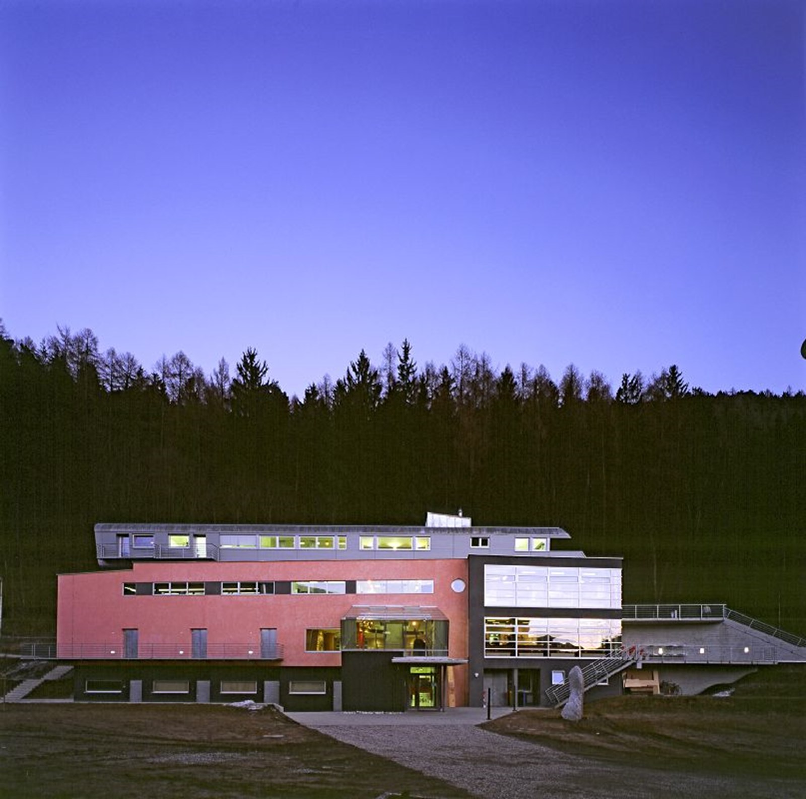 Das Jugendzentrum UFO liegt in der Schulzone von Bruneck am Waldheimerweg, nahe der Altstadt. Mit dem Groove Café ist es Treffpunkt für Jugendliche und beliebter Aufenthaltsort für Schüler. Der Bau fügt sich in den Hang des Kühbergls ein und nutzt das abfallende Gelände mit Terrassen als amphitheaterartigen Außenbereich. Grundlage der Planung war ein von Jugendarbeitern entwickeltes Raumprogramm, das funktionale Abläufe und Begegnungen fördert. Ziel war ein experimentelles, jugendliches Gebäude ohne Schwellenangst – ein Labor für Ideen und Entwicklungen. Alle Bereiche sind eigenständig zugänglich und mit den Außenflächen verbunden, zentrales Element ist das UFO-Café als Ort des Austauschs. Das Haus gliedert sich in vier Ebenen, verbunden durch zwei Eingänge und einen verglasten Erschließungskörper mit Treppen und Aufzug. Unten liegen Proberäume, Tonstudio und Werkstatt, im Hauptgeschoss Saal, Café, Terrasse und Freiluftbühne, darüber Büros und Seminarräume, ganz oben ruhige Zonen mit Bibliothek, Fotostudio und Gästezimmern. Zum zehnjährigen Bestehen wurden Bar und Fassade neu gestaltet.