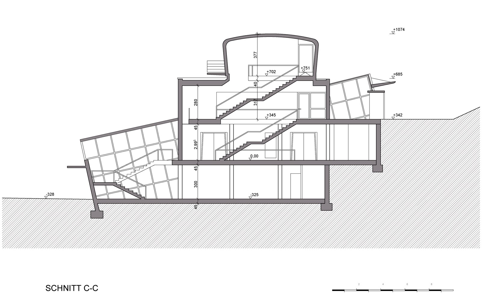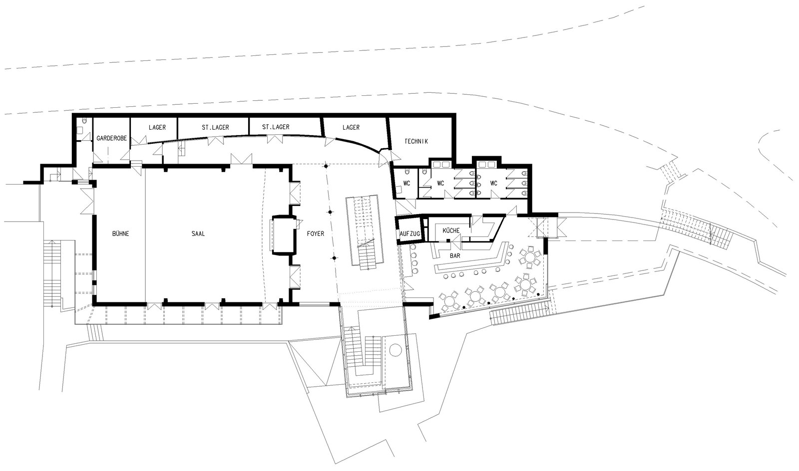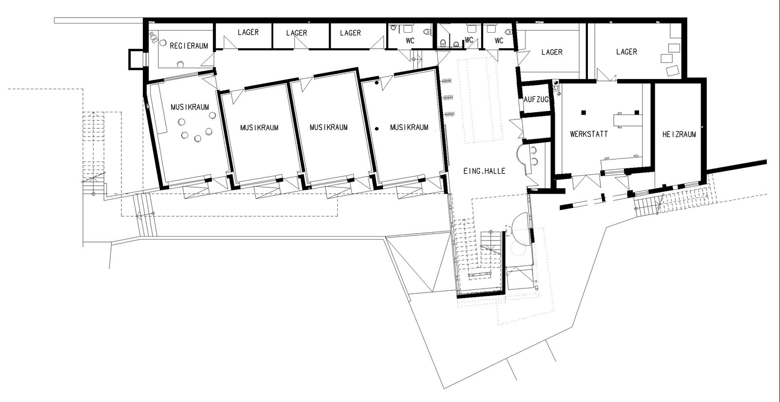 Das Jugendzentrum UFO liegt in der Schulzone von Bruneck am Waldheimerweg, nahe der Altstadt. Mit dem Groove Café ist es Treffpunkt für Jugendliche und beliebter Aufenthaltsort für Schüler. Der Bau fügt sich in den Hang des Kühbergls ein und nutzt das abfallende Gelände mit Terrassen als amphitheaterartigen Außenbereich. Grundlage der Planung war ein von Jugendarbeitern entwickeltes Raumprogramm, das funktionale Abläufe und Begegnungen fördert. Ziel war ein experimentelles, jugendliches Gebäude ohne Schwellenangst – ein Labor für Ideen und Entwicklungen. Alle Bereiche sind eigenständig zugänglich und mit den Außenflächen verbunden, zentrales Element ist das UFO-Café als Ort des Austauschs. Das Haus gliedert sich in vier Ebenen, verbunden durch zwei Eingänge und einen verglasten Erschließungskörper mit Treppen und Aufzug. Unten liegen Proberäume, Tonstudio und Werkstatt, im Hauptgeschoss Saal, Café, Terrasse und Freiluftbühne, darüber Büros und Seminarräume, ganz oben ruhige Zonen mit Bibliothek, Fotostudio und Gästezimmern. Zum zehnjährigen Bestehen wurden Bar und Fassade neu gestaltet.