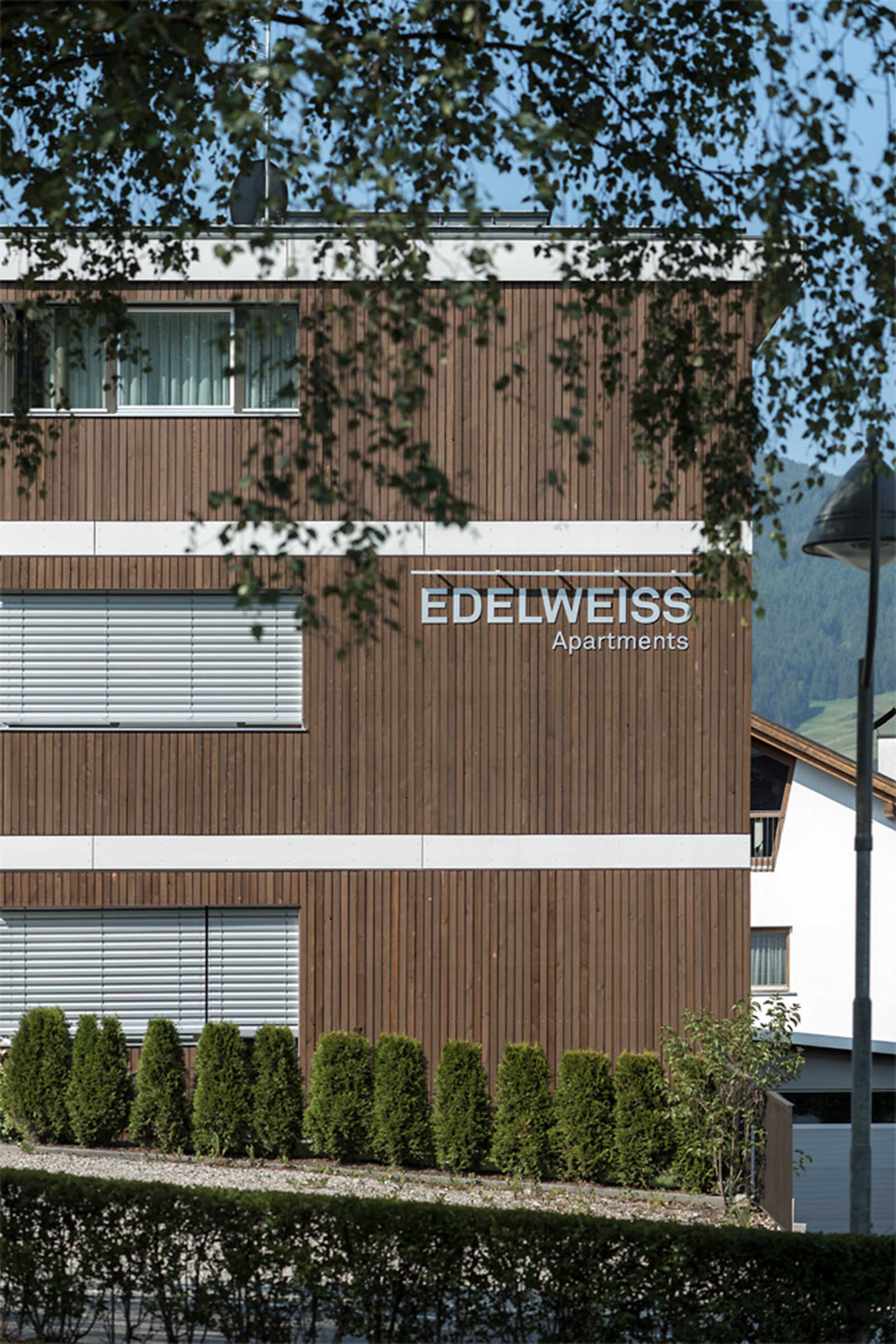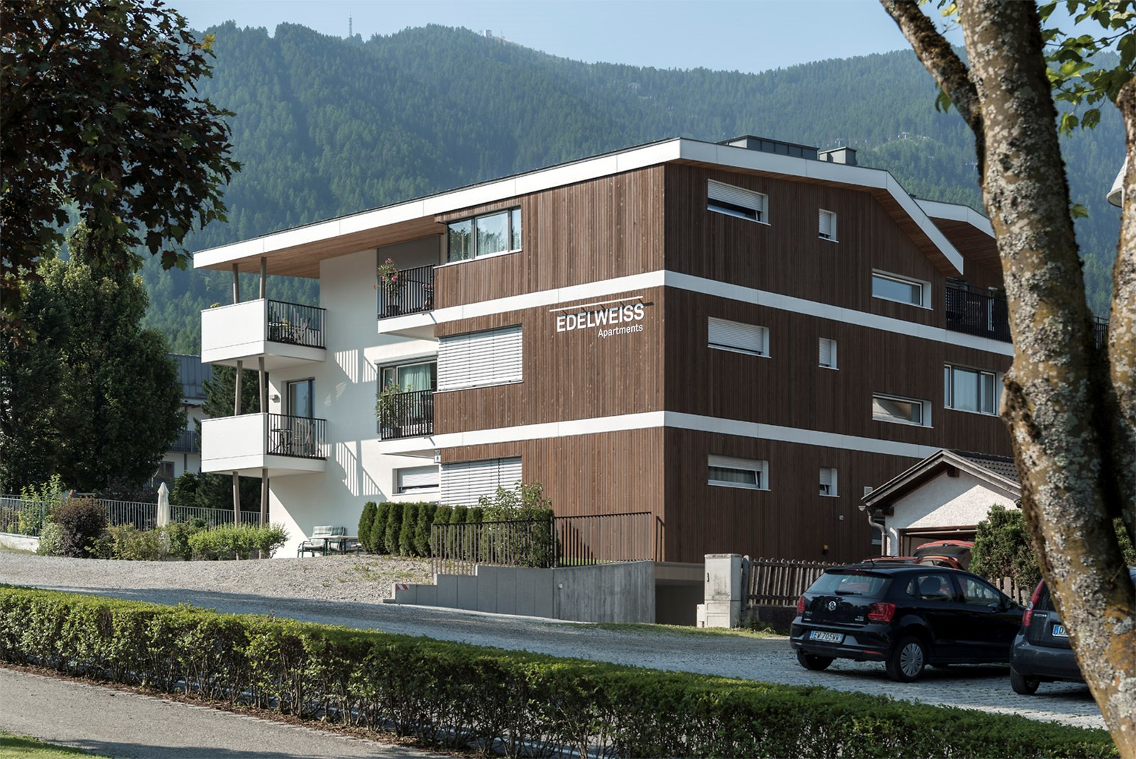 Für die Neugestaltung des Garni Pension „Edelweiß“ entschieden sich die Bauherren gemeinsam mit den Architekten für einen behutsamen Neubeginn: Lediglich die jüngeren Zubauten im Westen und der Kellerbereich blieben erhalten, während der restliche Altbestand Platz für einen klaren, modernen Baukörper machte.