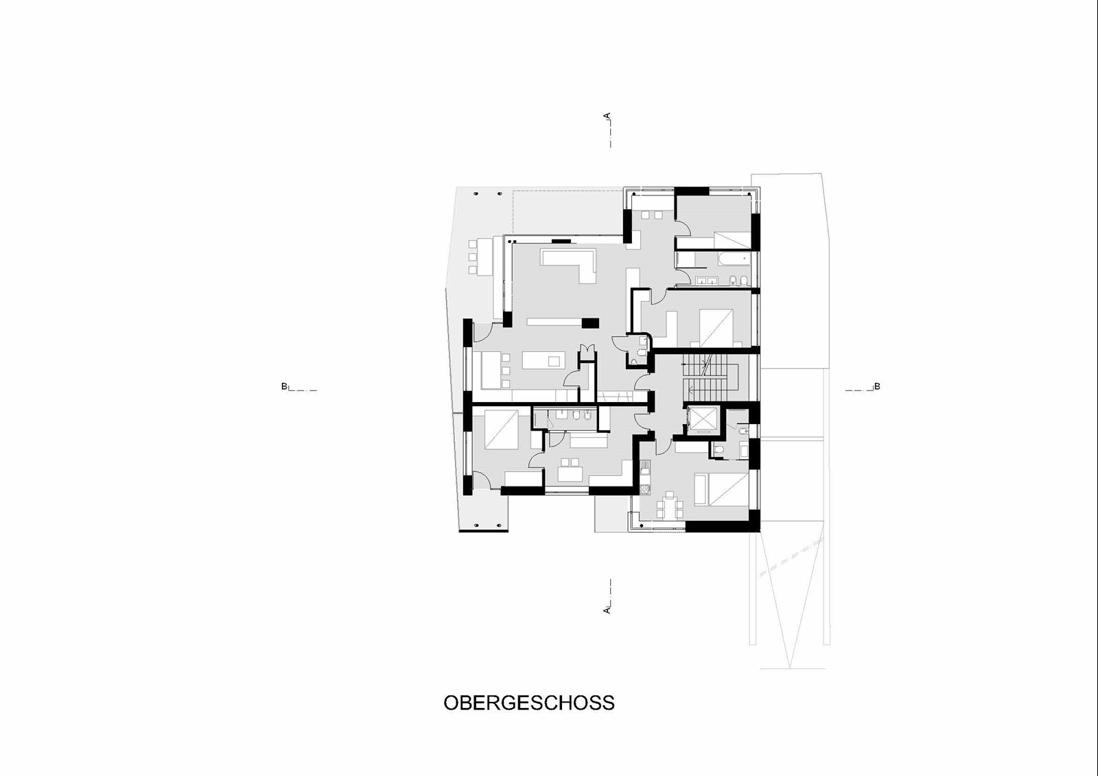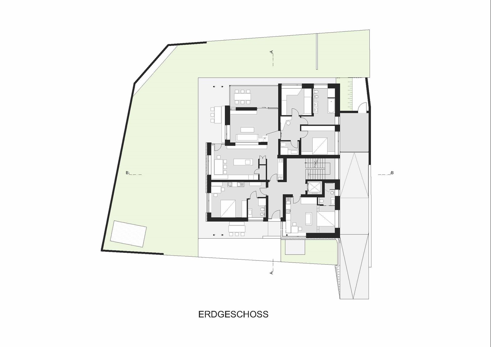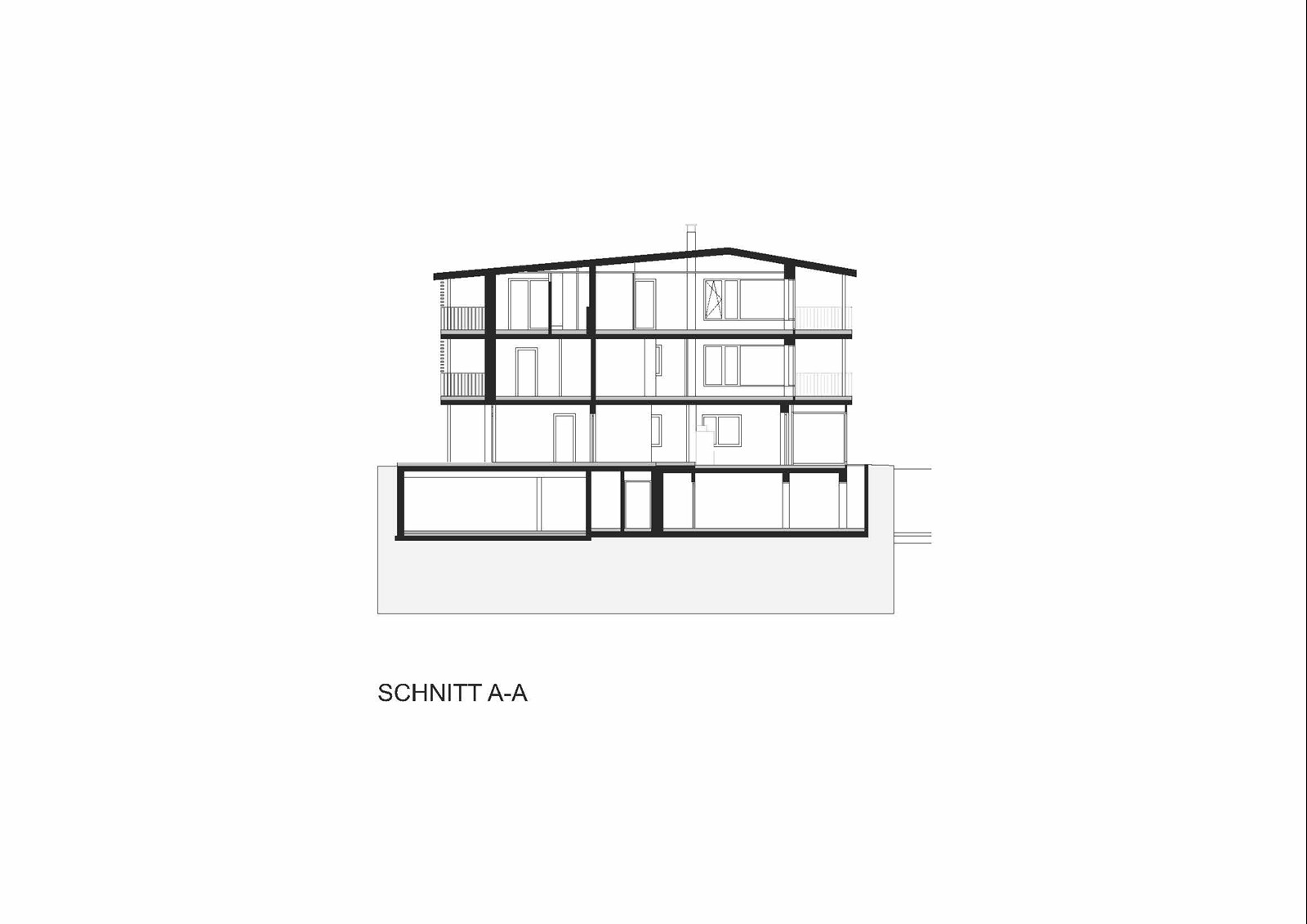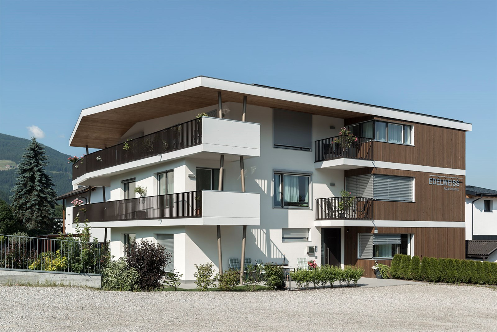 Architektonisch präsentiert sich das Haus als schlichter, solitärer Baukörper mit klassischem Satteldach. Großzügige Terrassen, Loggien und Balkone glätten die Vor- und Rücksprünge des Volumens und schaffen eine harmonische, geschlossene Silhouette. Gleichzeitig öffnen sie die Innenräume zum Licht und zur Umgebung, verweben das Gebäude subtil mit dem alpinen Landschaftsraum und verleihen dem Neubau eine klare, einladende Identität.