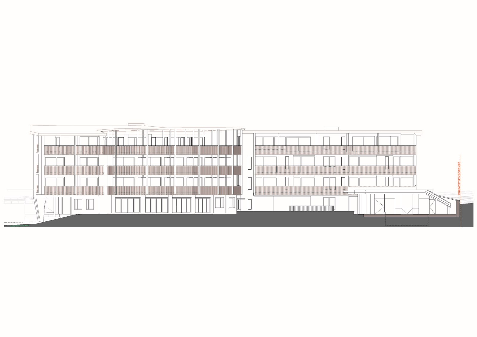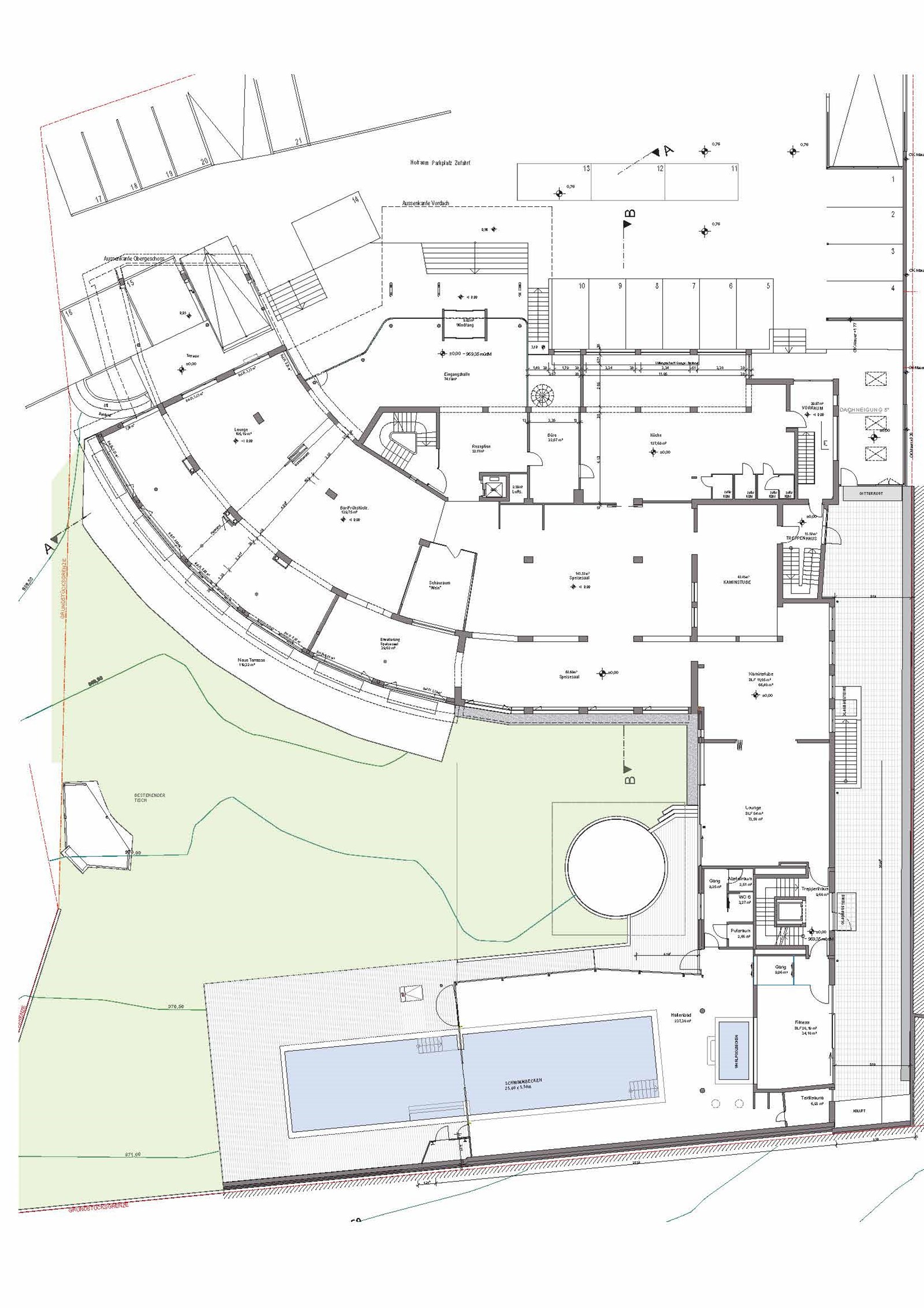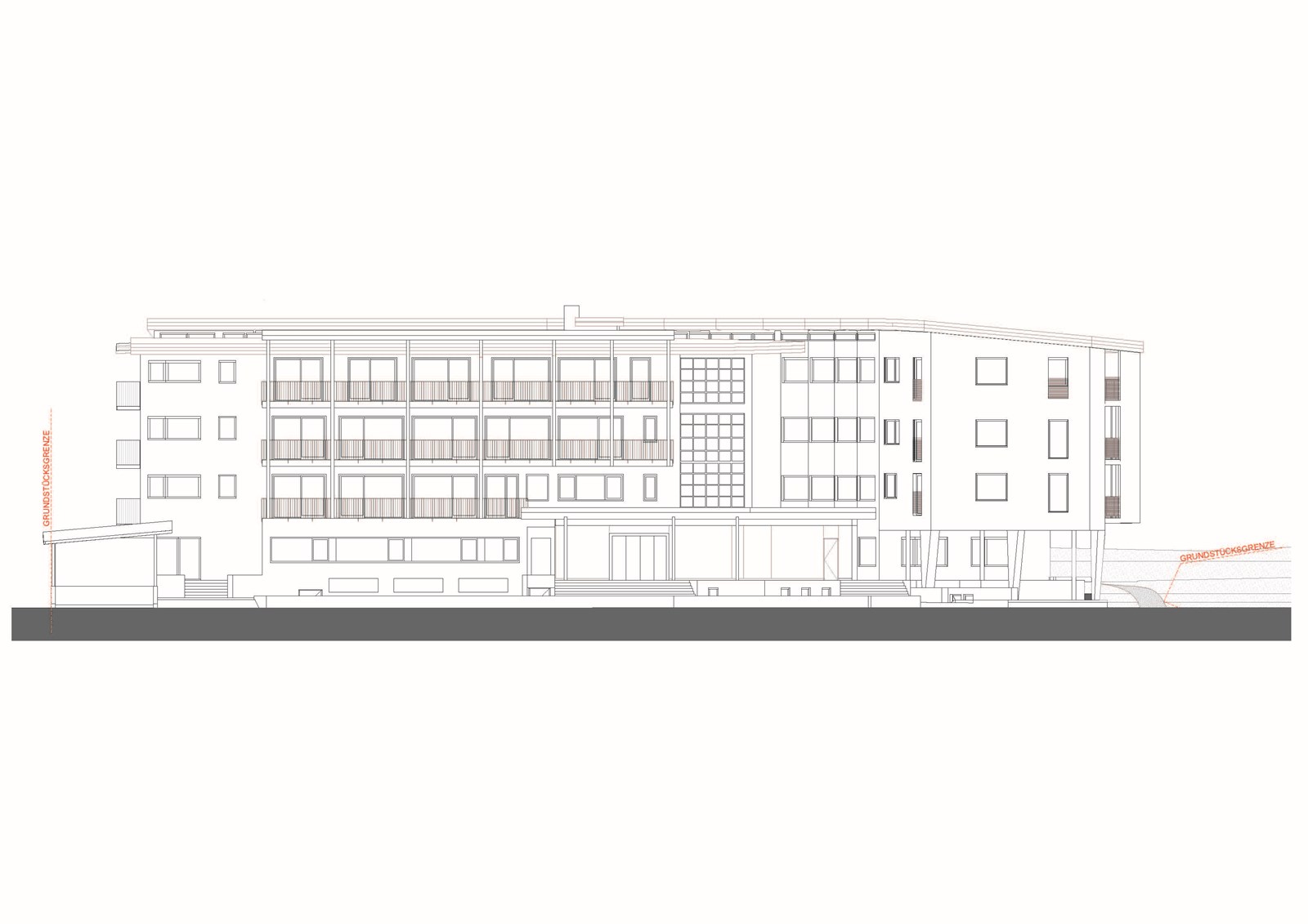 Im Erdgeschoss schließt der neue Baukörper L-förmig an den Bestand an, während das Untergeschoss durch einen großzügigen Innenhof als vollwertiger Wellnessbereich nutzbar wird. Die Obergeschosse mit den Suiten fügen sich linear an den Bestand an und schaffen so eine klare, elegante Gliederung des Gebäudes. Das Zusammenspiel von Bestandsgebäude, Erweiterung und Umgebung vermittelt Ruhe, Ordnung und Großzügigkeit – die Architektur öffnet sich der Landschaft, ohne ihre stimmige, kompakte Form zu verlieren.