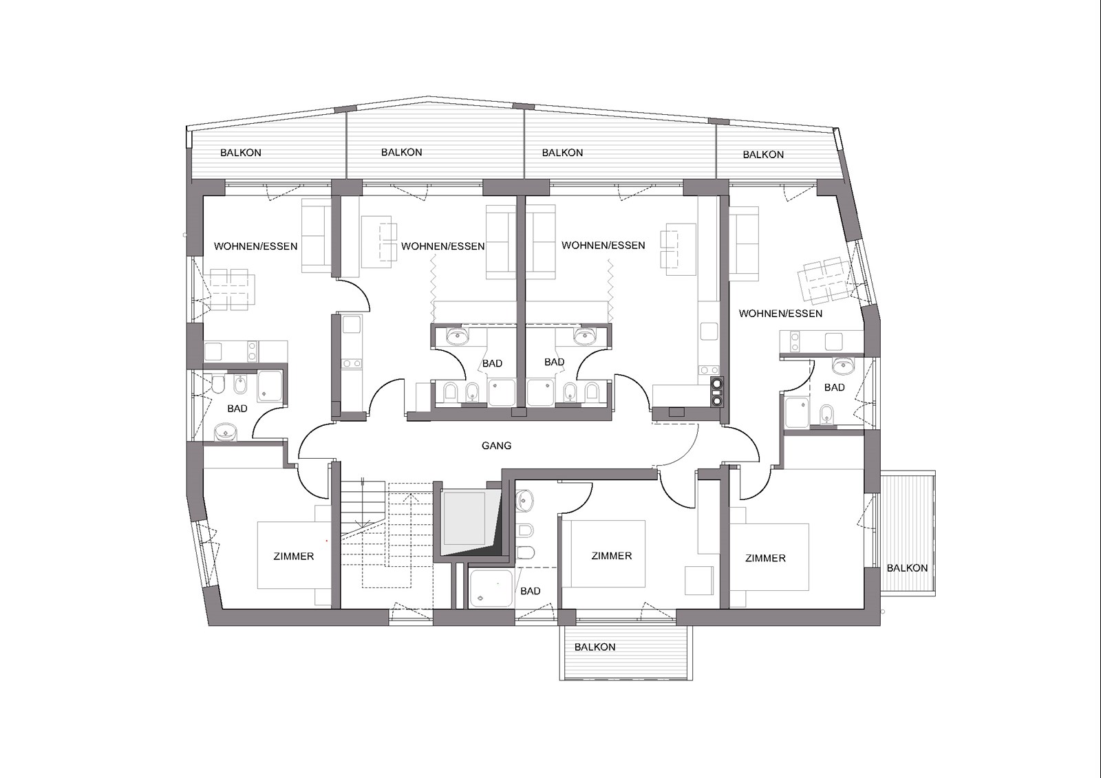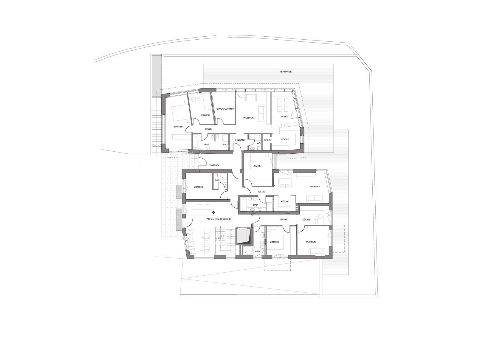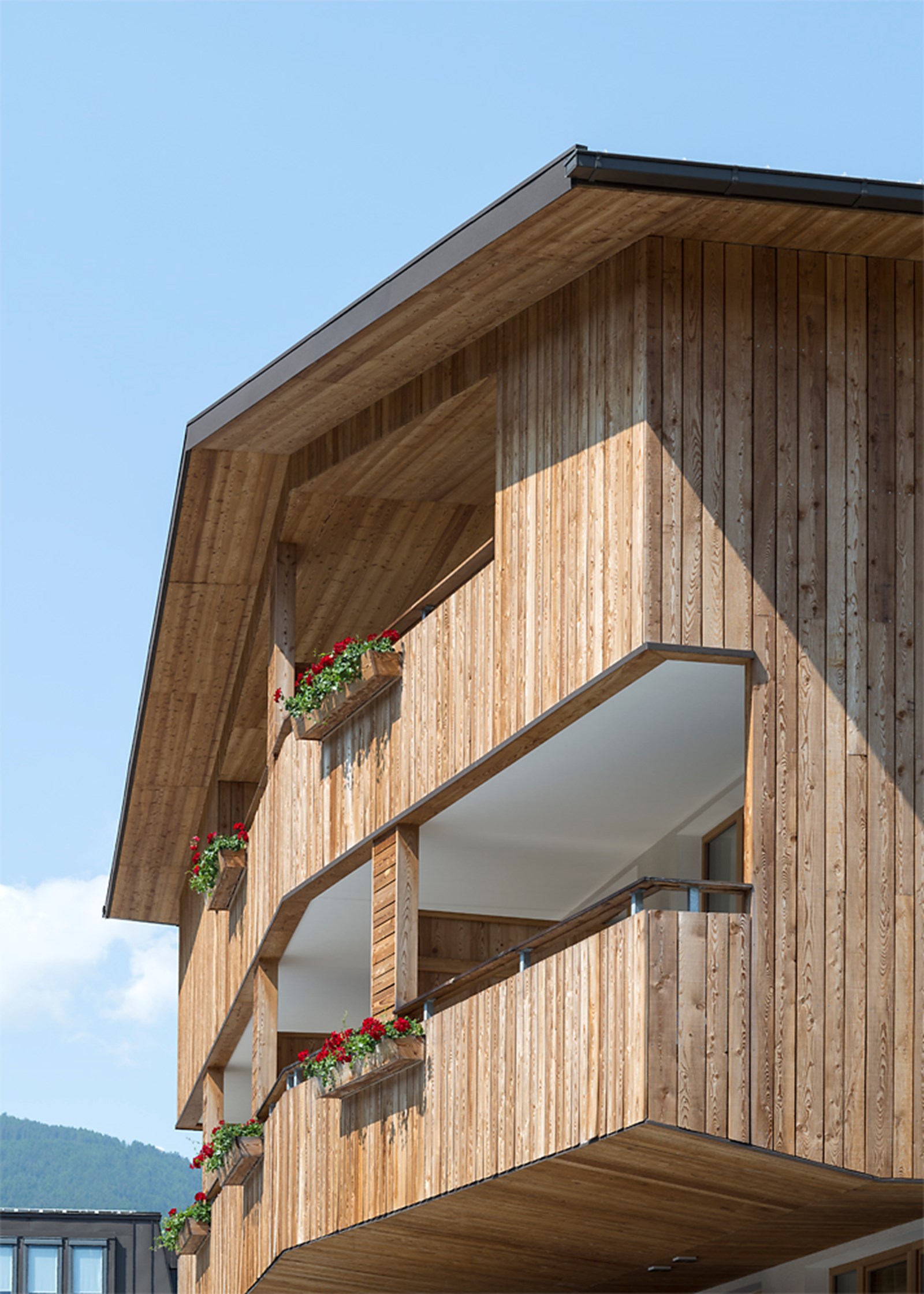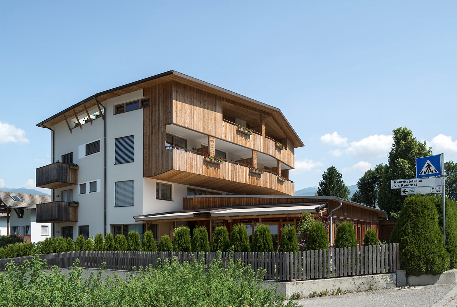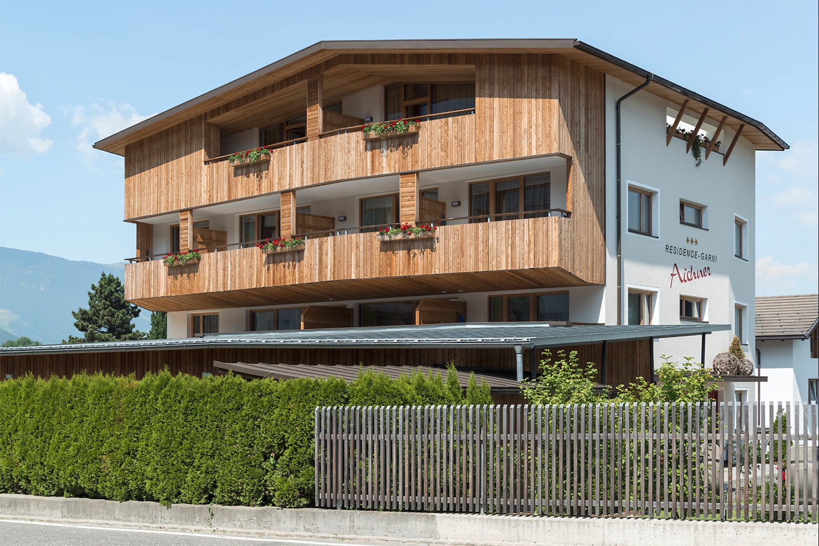 Die Pension „Aichner“ aus den 1960er-Jahren wurde abgerissen und durch eine moderne Residence mit elf Ferienwohnungen und Wohnungen der Besitzerfamilie ersetzt. Das Gebäude fügt sich harmonisch in die Umgebung ein und verbindet zeitgemäße Architektur mit familiärer Nutzung. Ein ursprünglich geplanter südlicher Anbau als Bar und Restaurant wurde verworfen; heute beherbergt er die Wohnung der nächsten Generation und bildet einen eigenständigen Teil des Ensembles. Im Erdgeschoss liegen Rezeption und Aufenthaltsbereich, daneben die Eigentümerwohnungen. Das Untergeschoss bietet Wellnessbereich, Skidepot und Nebenräume. Die elf Obergeschosswohnungen sind lichtdurchflutet und funktional gestaltet und bieten Komfort für Gäste jeden Alters. Großzügige Fenster, Balkone und Terrassen eröffnen weite Ausblicke auf die Berge und lassen Bewohner und Gäste die Landschaft unmittelbar erleben. So vereint die Residence moderne Wohnqualität und flexible Nutzung.